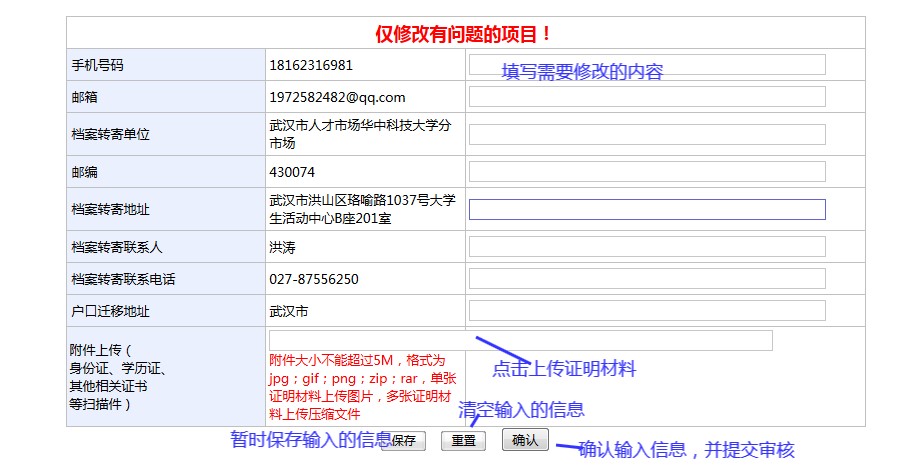 3、“政治面貌”、“专业”、“生源地”等信息需要修改,请提供证明材料,联系辅导员老师修改。