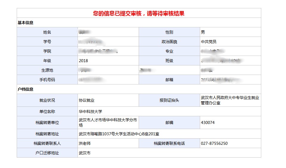 3、提交审核后,显示修改后的就业信息: