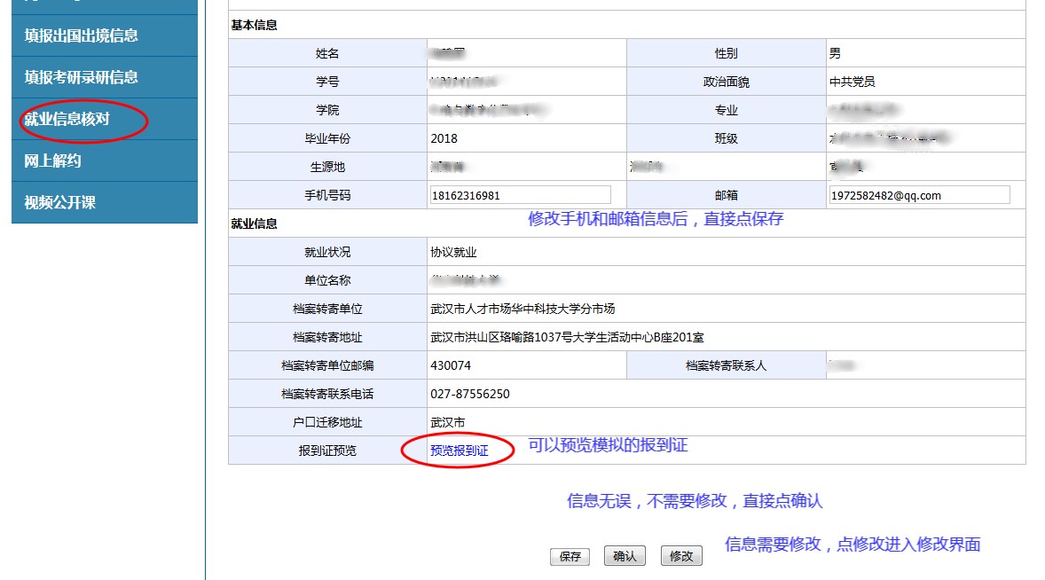 2、如果就业信息有问题,点击修改后进入修改界面:
