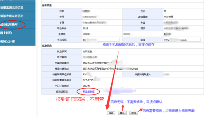 ①如果各项信息不需要修改,或只有手机号码和邮箱需要修改,请直接修改后,只点击“保存”。