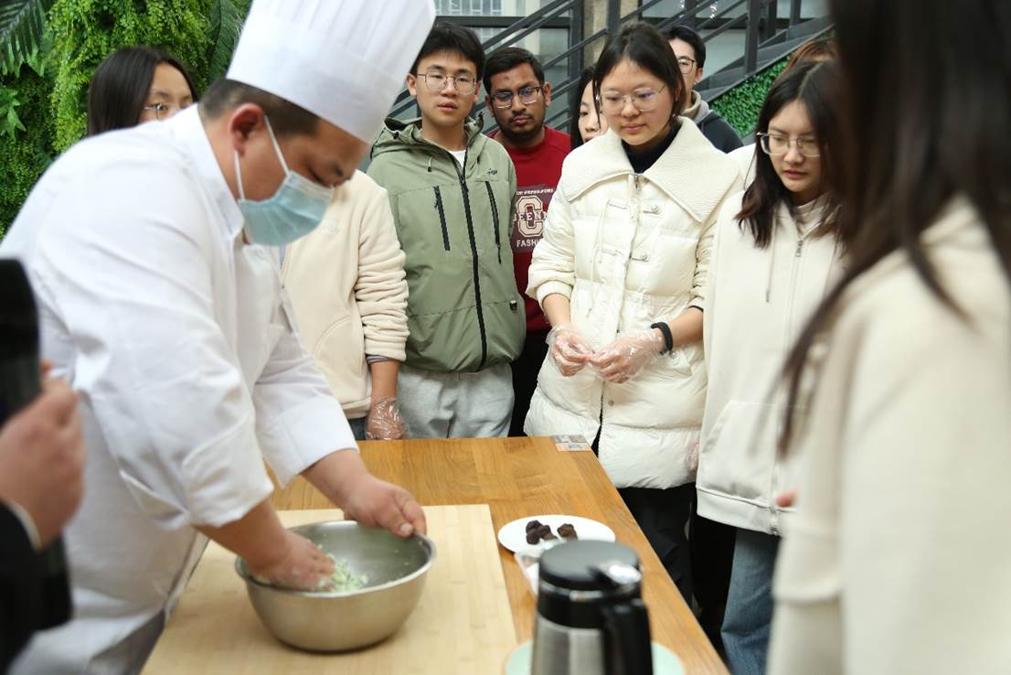 视频结束后,后勤的大厨师傅现场揭秘青团制作秘诀:为兼顾口感与颜值,面团以澄面混合菠菜汁替代传统艾草汁,红豆沙馅料甜香绵密。只见师傅将翠绿面团揉圆压扁,裹入馅料后轻拢成团,一颗圆润可爱的青团跃然掌心。同学们围拢观摩,跃跃欲试。戴上手套后,中外员工在老师们的指导下尝试包馅,她一边讲解技巧,一边询问大家的家乡清明习俗,笑语中文化悄然交融。