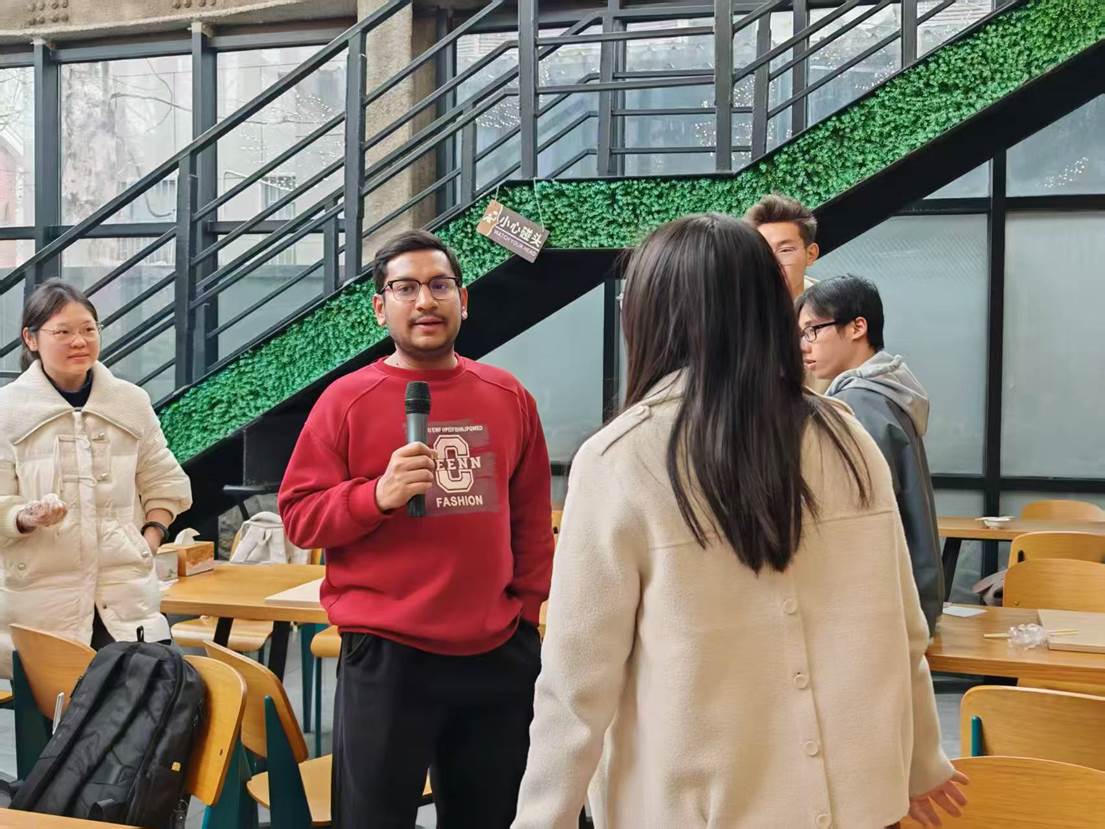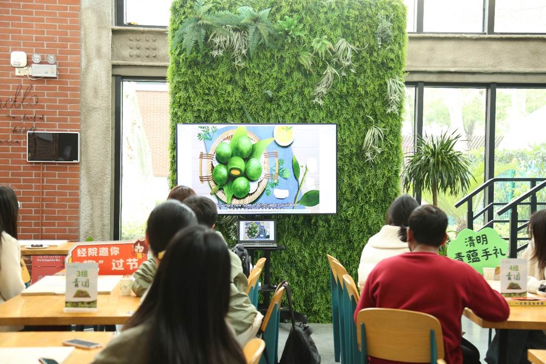 活动会场早已布置妥当:桌椅整齐排列,组别牌静候学子,门口的清明青团主题指示牌渲染出节日氛围。随着经院学子与国际生陆续到场,抽签分组的环节瞬间拉近了彼此距离。活动在马文丽的亲切致辞中拉开序幕,中英双语视频带大家走进清明文化长卷——从《岁时百问》的节气渊源到“清明前后,种瓜点豆”的农耕智慧,从扫墓踏青的习俗到青团承载的寒食记忆,传统文化的脉络清晰呈现。职工们专注聆听,在文化共鸣中拉近与中国传统节日的距离。
