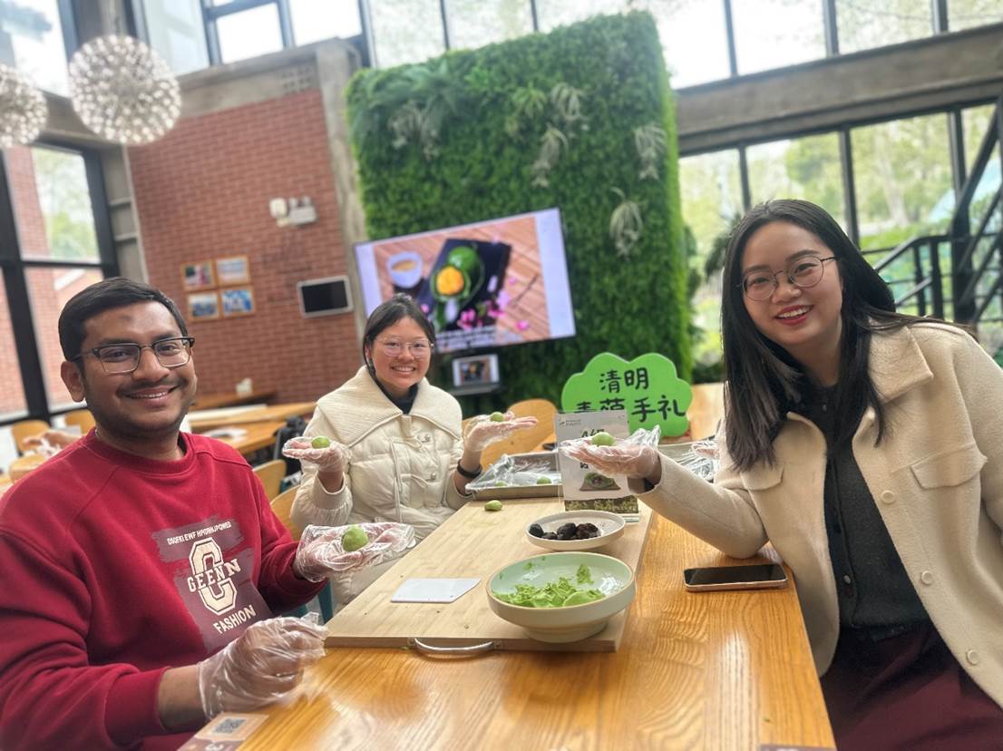 十分钟的蒸制等待后,碧玉般的青团热气腾腾出炉。同学们纷纷定格“手机先吃”的仪式感,咬下一口亲手制作的美味时,软糯外皮与红豆清甜瞬间俘获味蕾,红豆香甜与劳动成就感双重绽放。越南职工阮黄梅感叹“第一次触摸中国节气的温度”,孟加拉国职工侯亦凡分享了自己家乡与清明相同的习俗,来自湖北的贾灵毓同学则分享了每年假期与家人一起制作糯米果的经历。
