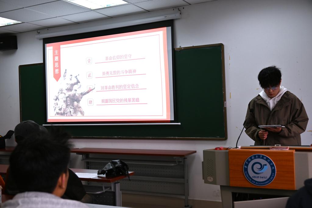 读书分享会第一环节为2024级硕士生应用经济学党支部陈宜群、周上钦同志进行书籍分享,他们分享的书籍是《红岩》。