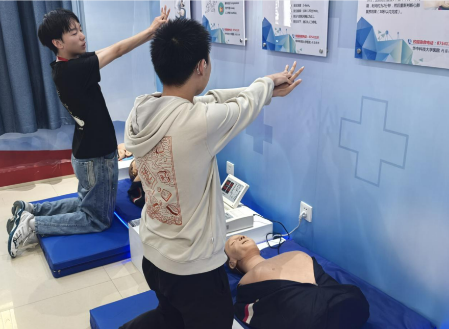 急救模拟环节中,同学们在专业指导下进行了心肺复苏(CPR)实操训练,认真学习动作要领,掌握按压力度和抢救时间,基本掌握了心肺复苏的完整流程。同时,同学们还深入了解了自动体外除颤器(AED)的工作机制和使用步骤,增强了面对突发生命安全事件时的应对能力。