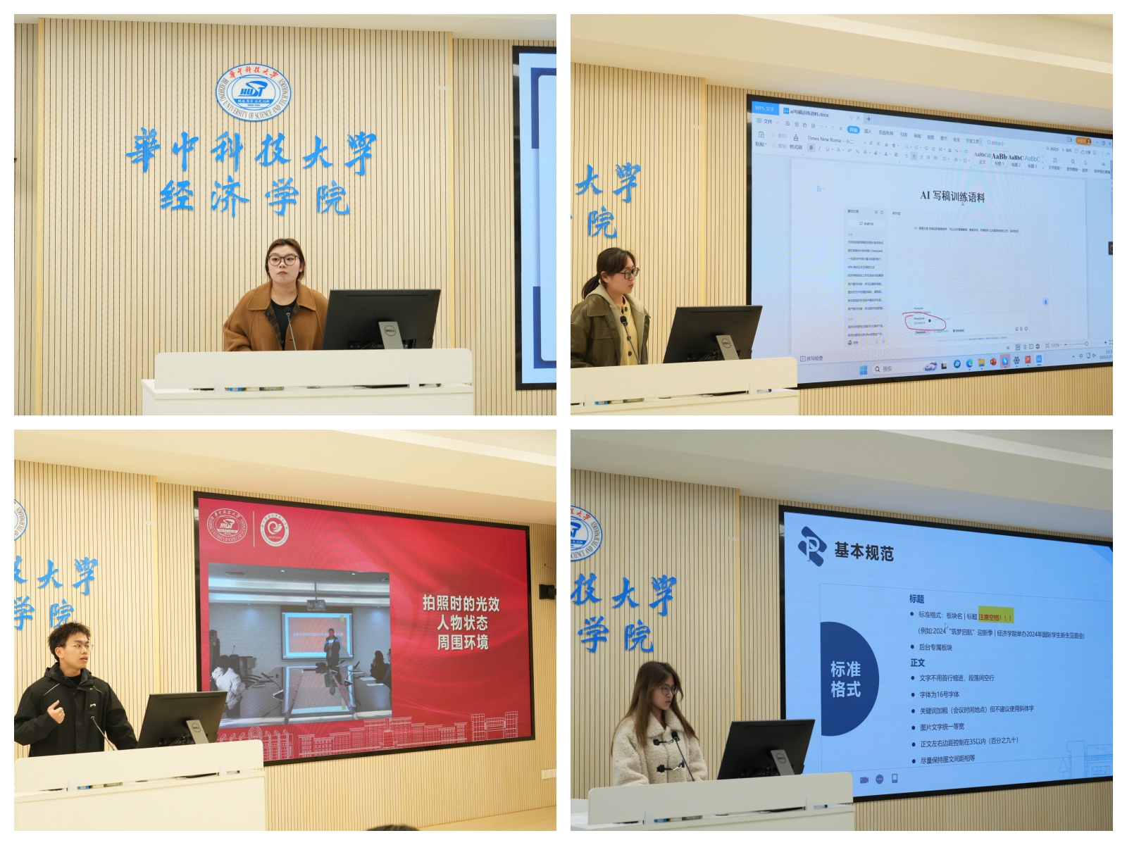 培训会上,首先围绕新闻稿图文组稿用稿标准展开详细讲解。新闻中心研究生部负责人王倩倩不仅分享了新闻稿的写作规范和选图原则,更具体介绍了新闻稿写作中应该注意的细节问题;新闻中心摄影部部长孙棵详细讲解了新闻稿图片的拍摄与筛选,真正诠释了何为“好照片”;研究生宣传德育助理李海林则联系当下热点,分享了如何用人工智能提升新闻稿写作效率。三位骨干成员的分享干货满满,大家受益匪浅。新闻中心新媒体部部长王梦斐分析并总结了出现在微信推文排版与投稿规范方面的各种细节问题,并且通过对比正误的排版格式,帮助大家提升新闻稿排版的规范性,助力新闻稿的视觉排版效果的提升。