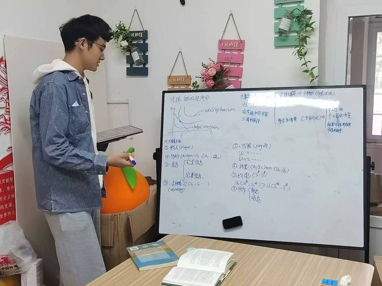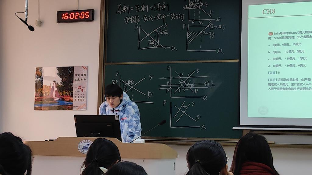 12月7日下午,薪火助学第一期围绕《经济学原理》课程在东九楼D305开展学业帮扶,经创2301班王天纵面向24级同学讲解了经济学原理的典型例题,他通过ppt演示和板书结合讲解,介绍课程相关的知识点和基本方法。同学们专心听讲,认真做笔记,现场学习氛围浓厚。