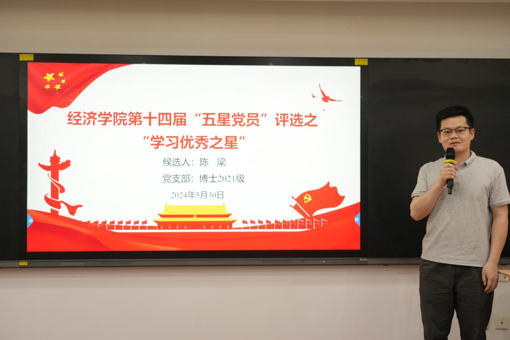 学习优秀之星候选人:陈梁从党员的“初心三问”出发,深入剖析自身党员身份,将论文写在祖国大地上;张云飞主动践行知行合一,结合现实问题做科研,在学术道路上展现经院学子担当。
