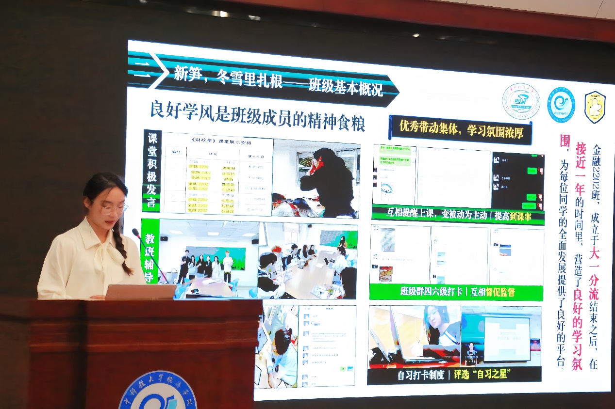 本场分为答辩和现场展示两个环节,金融2201班、金融2202班、国商2202班的班级代表依次上台展示本班风采。答辩环节中,班委以班级学风建设、文体活动、志愿活动、班级特色和对“胡吉伟精神”的传承等方面展开介绍,现场展示环节中,大家以歌曲、舞蹈等形式展示班级风采,表达同学们对胡吉伟学长的缅怀与崇敬,以及对胡吉伟精神的感悟与实践。