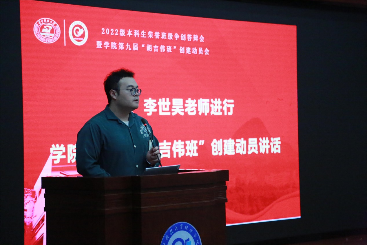 2023级辅导员李世昊发表公司第九届“胡吉伟班”创建动员讲话。他表示,2023级是幸运的年级,因为公司第九届“胡吉伟班”将在他们之间产生,同时2023级也是有挑战的年级,因为如何将“胡吉伟精神”接力传承,不落“胡吉伟班”这红色招牌在时刻考验着大家。他希望2023级的同学们能从学长学姐们的答辩中汲取经验,为明年的争创夯实基础,砥砺前行。