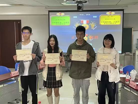 比赛包括开篇立论、盘问环节、驳辩环节、对攻环节、攻辩小结、自由辩论、结辩陈词七个环节。比赛过程中,正方为国商2202班代表队,反方为经创2201班代表队。双方辩手思维敏捷,逻辑清晰,运用详实的论据与缜密的语言阐释己方观点,攻击对方漏洞。就相关观点强强交锋,据理力争,为在场观众奉献了一场精彩纷呈的思想盛宴 。