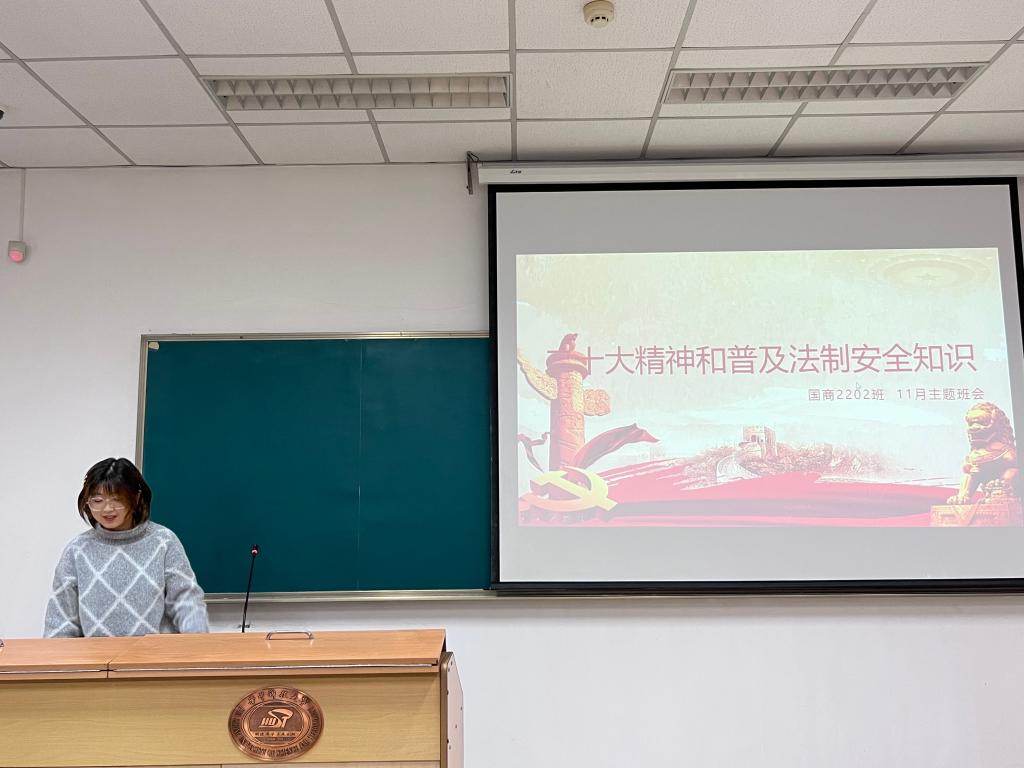 2022年11月24日晚上七点,惠风和畅,在党的二十大胜利闭幕之后,为进一步深刻学习落实习近平新时代中国特色社会主义思想,落实《高举中国特色社会主义伟大旗帜 为全面建设社会主义现代化国家而团结奋斗》习近平总书记重要讲话精神,引导班级成员深刻认识“坚持全面依法治国 推进法治中国建设 ”的重要意义,2·022级国际商务二班在东九教学楼D314教室以“二十大精神和普及法制安全知识”为主题召开了主题班会,班级进一步深刻学习了党的二十大精神,进一步激发了同学们学习党的二十大的热情,形成了良好班级氛围。国际商务二班全体成员参与本次班会,班长宋梦瑶主持本次班会。