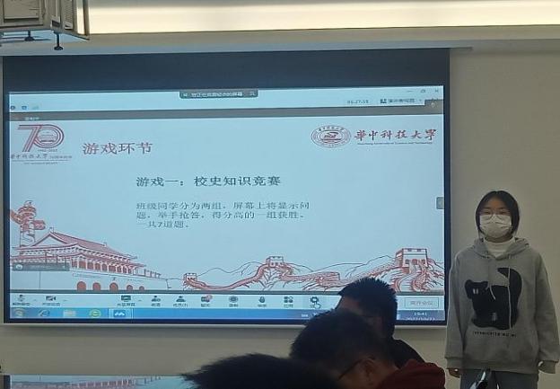 为检验同学们的听讲情况和学习成果,班长张卓佳开展了校史党史主题游戏,将校史党史以及二十大会议重点与同学们熟悉的击鼓传花、传话筒等游戏相结合,活化会议氛围的同时加深了同学们对班会主题的理解。最后,游戏获胜的队伍得到了公司文创产品的奖励,失败的队伍一同唱起校歌,愉快而轻松地结束了这一环节。
