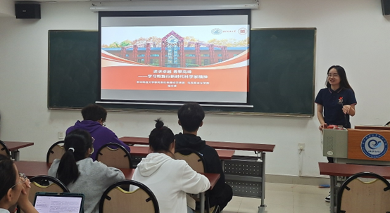 紧接着,校研究生红色理论学讲团成员喻文婷给全班同学带来了“追求卓越,勇攀高峰——学习和践行新时代科学家精神”主题微党课。她从百年复兴路与科学家精神的形成入题讲解新时代科学家精神的具体内涵,再分别对爱国精神、创新精神、求实精神、奉献精神、协同精神和育人精神这六大内涵进行阐释。每一内涵的阐释过程中都采用了众多新时代科学家们的事例,生动展示了每一内涵的真实写照与时代意义。另外,她结合疫情的时代背景,联系华中大员工与老师的经历,使同学们感受到身边的科学家精神。最后以一首打油诗作为宣讲的结束,以轻快的方式加深同学们对新时代科学家精神的学习与理解。