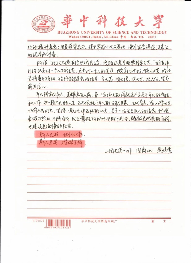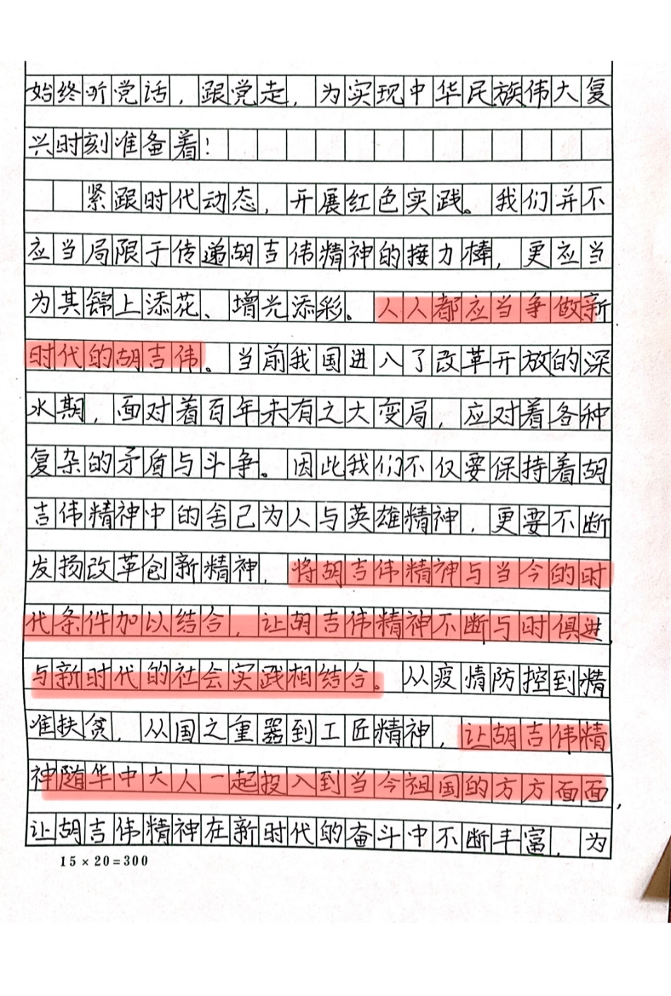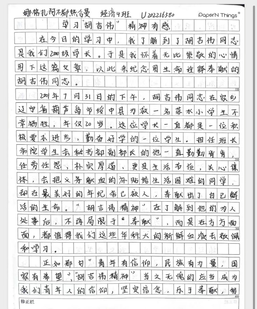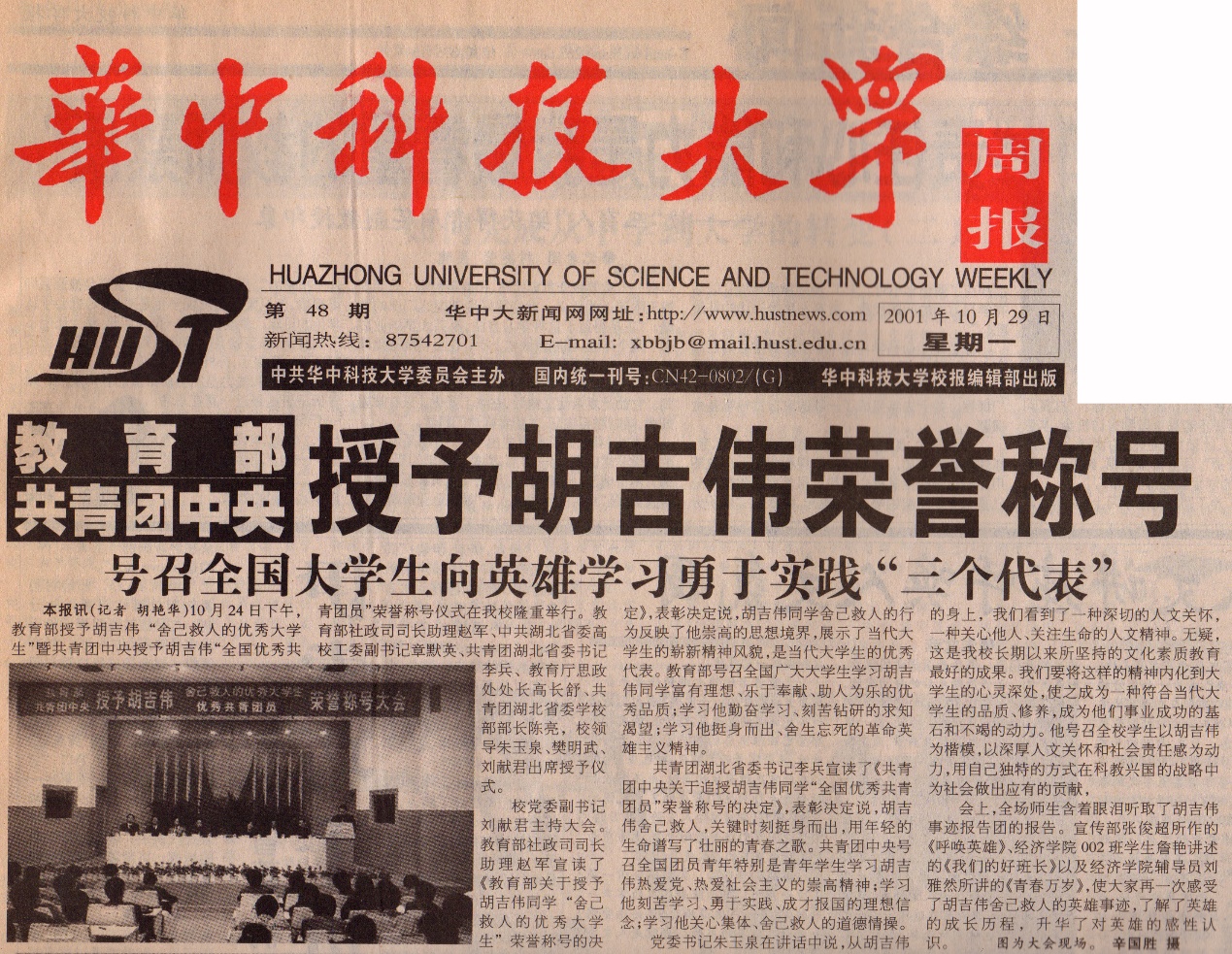 人人都应争做新时代的胡吉伟,将胡吉伟精神与当今的时代条件相结合,让胡吉伟精神不断与时俱进,伴随华中大人一起传播到祖国的各个角落。
