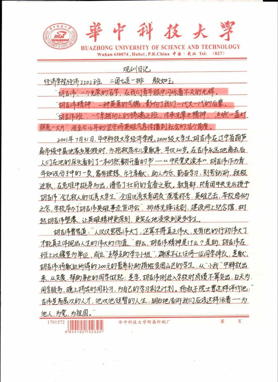 胡吉伟,一个名字,一种班级,一类精神,一座丰碑,感召了无数华科人不计小我,成就大我,激励我们多行善事,不做恶行。我们学习胡吉伟精神,绝不是轰轰烈烈的兴趣使然,更应是春雨润物无声的持之以恒。