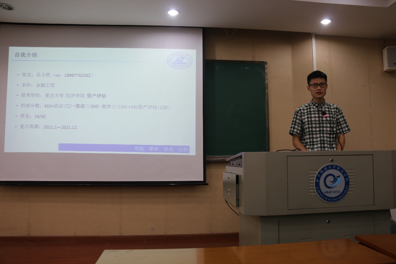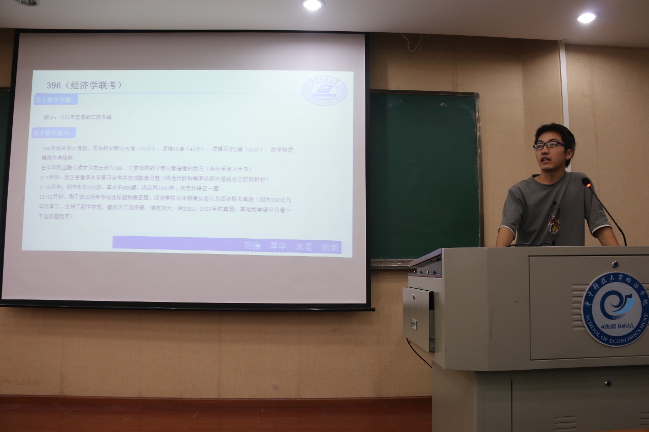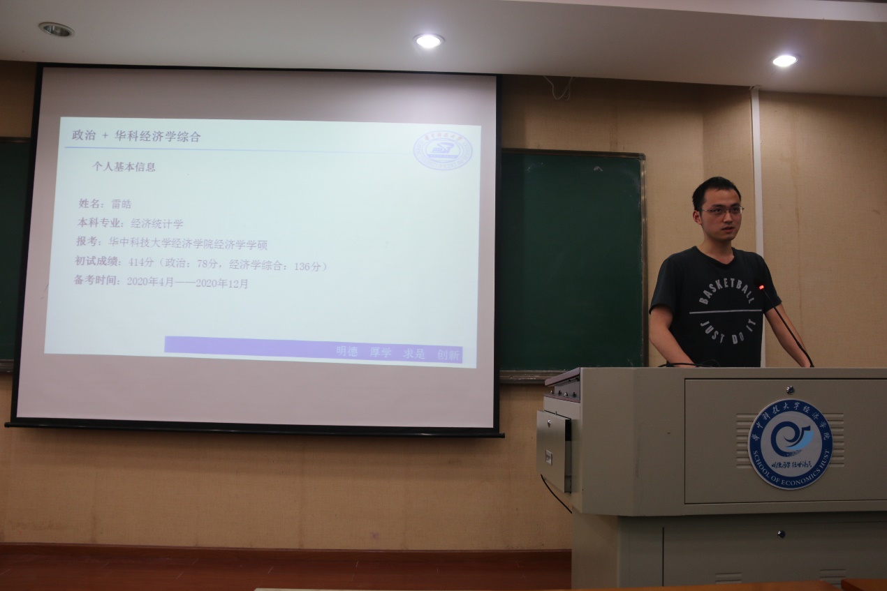 考研至永利3044noc经济学学硕的雷皓分享的是关于政治科目和华科经济学综合学习方面的经验。在政治科目的学习上,他认为,九月份是复习政治的最佳时机,在此之前可以背单词,学数学,同时雷皓推荐了几位政治网课的老师和相应的教材。在经济学综合方面,雷皓说主线任务就是看教材,做真题,三本教材一定要全部仔细看完,平均每天50页,对于名词解释以及公式一定要熟记在心,其次再好好看一看教材的课后习题和教辅资料。而在剩下最后三个月时,就要开始背诵,无论是教材内容还是课后习题,背诵极其重要,雷皓再三嘱咐:专业课的背诵甚至比政治更重要。背诵过后便是做真题,他表示:真题资源稀缺,要做到应做尽做,绝不嫌多。最后,雷皓还通过百度网盘的二维码分享了经济学相关的学习资料。
