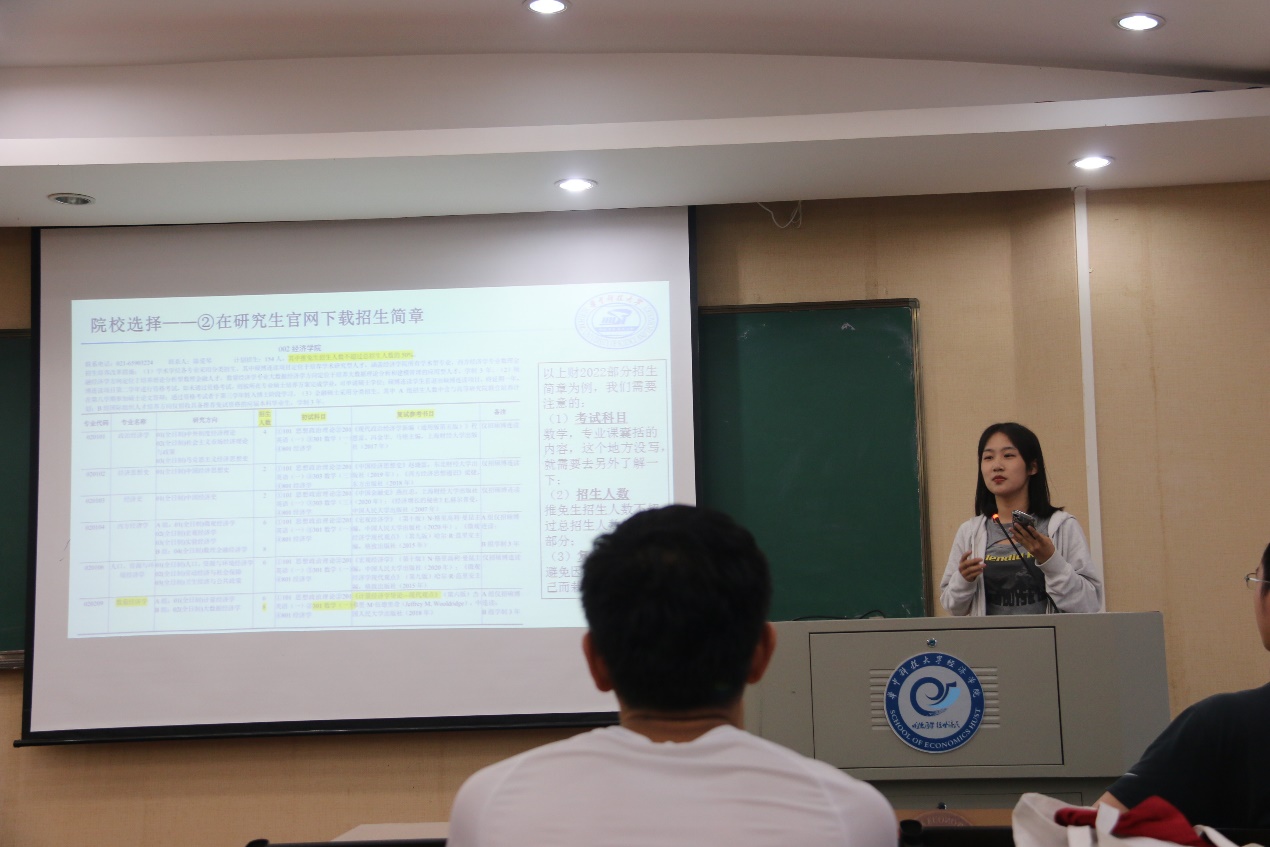 首先分享的是李钰捷,她已成功上岸上海财经大学永利3044noc数量经济学学硕。李钰捷为在场的学弟学妹分享了考研院校选择和数学复习方面的经验。关于院校选择,李钰捷认为,首先要根据自身偏好确定院校的大致范围,然后在研究生官网下载招生简章,了解招生人数、初试科目以及复试参考书目,之后结合所有信息进行排除和选择,比如关于专业课要规避自己不擅长的领域。除此,还要选择自己偏好的城市,权衡学硕与专硕,考虑往年的招生数据和自身的能力等等。在数学复习上,李钰捷分享了数学复习的三个阶段应该做什么,并且推荐了网课老师和复习资料,然后从三个方面分析了数学应该怎么复习:跟什么老师,刷什么题,怎么做错题本和笔记,同时也推荐了很多学习资源和整理错题的技巧方法。最后她强调:“在考研复习中千万不要心浮气躁,要有毅力并且相信自己。”