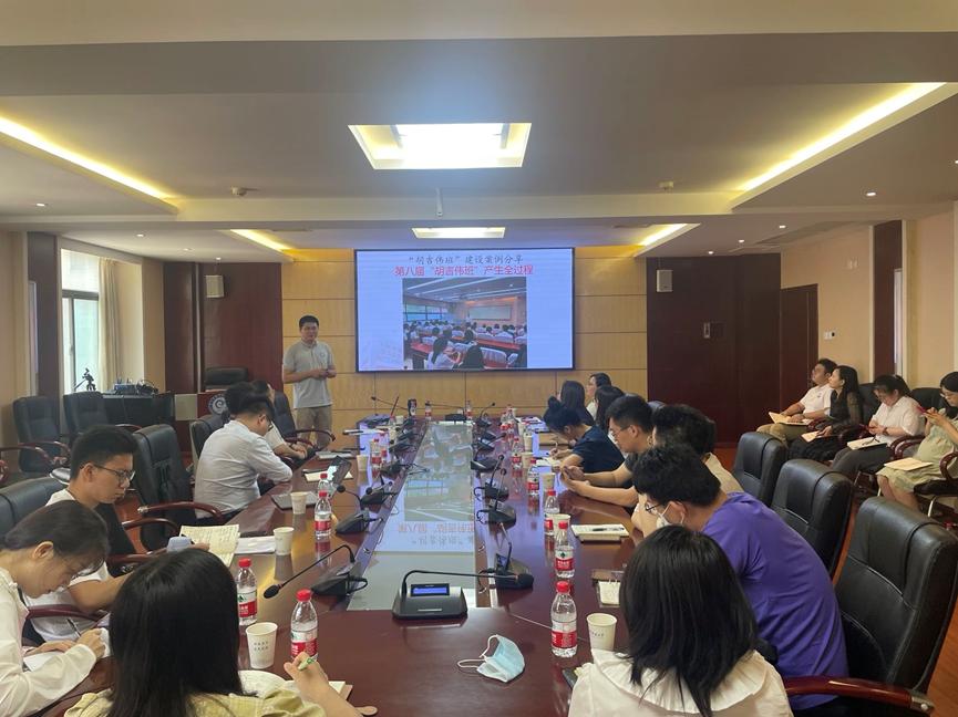 随后,辅导员彭鹤翔就“公司第八届胡吉伟班”的产生全过程进行案例分享。他指出从公司新生年级大会上介绍胡吉伟学长的先进事迹,到全院师生每年清明节祭扫胡吉伟塑像,再到“胡吉伟班”的争创,都在着力为同学们营造一种尊崇感和仪式感,让每一位员工接受熏陶。他从各班级争创公司“胡吉伟班”的案例出发指出,建设“胡吉伟班”,关键在于展现班级体的凝聚力和荣誉感,只要注重班级建设、展现班级风采,班级同学积极传承胡吉伟精神,每个班级就都是“胡吉伟班”。