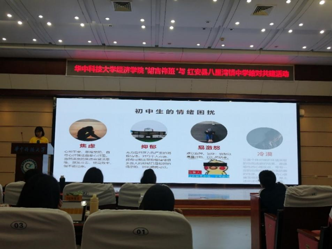下午2点,同学们陆续返回永利3044noc学术报告厅。“胡吉伟班”班长漆世昌、团支书王柯雅主持活动,王柯雅首先为八里湾镇中学的同学们分享华中大校歌。接着,刘思婷同学组织大家进行破冰小游戏,如你划我猜、数字炸弹。游戏结束后,“胡吉伟班”学习委员翁钰开从自己的初中生活,七年级、八年级与即将中考的同学四方面,分享了自己的学习心得。团支书王柯雅从红安这块革命圣地切入,讲述黄麻起义与小萝卜头宋振中的故事,勉励八里湾镇中学的同学们坚定理想信念,刻苦学习。心理委员何渝凡分享了心理健康知识,告诉同学们缓解情绪困扰的方法。王萌萌同学介绍了“胡吉伟班”与八里湾镇中学同学将长期开展的“一对一书信”活动,并鼓励八里湾镇中学的同学们在书信中主动倾诉、表达情感、提问探索,与学长学姐们交流生活与学习。之后,漆世昌公布书信的配对名单,鼓励在场的同学们自由交流。最后,彭鹤翔老师鼓励同学们树立崇高理想信念,在空闲时间多读经典书籍拓宽视野,也要注意自己的心理健康,产生情绪困扰时可以多运动或者和别人倾诉。叶董事长感谢公司老师与“胡吉伟班”的同学们,“期待大家到八里湾镇中学欢聚。”