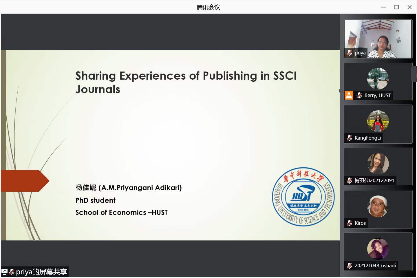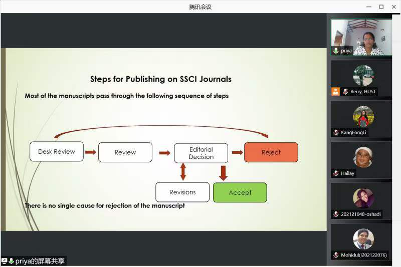 本次活动邀请了国际贸易学19级博士杨佳妮(PRIYANGANI ADIKARI ADIKARI MUDIYANSELAGE)进行分享,她分享的主题为“Sharing Experiences of Publishing in SSCI Journals”。杨佳妮在博士学习期间十分刻苦努力,目前已经在SSCI期刊上发表了一篇学术论文。她向同学们分享了自己的科研方法和心得体会,详细地介绍了SSCI论文的写作要求和投稿流程,鼓励国际员工珍惜学习时间,平时多思考,多向导师和相关领域的专家请教,多与他人合作。