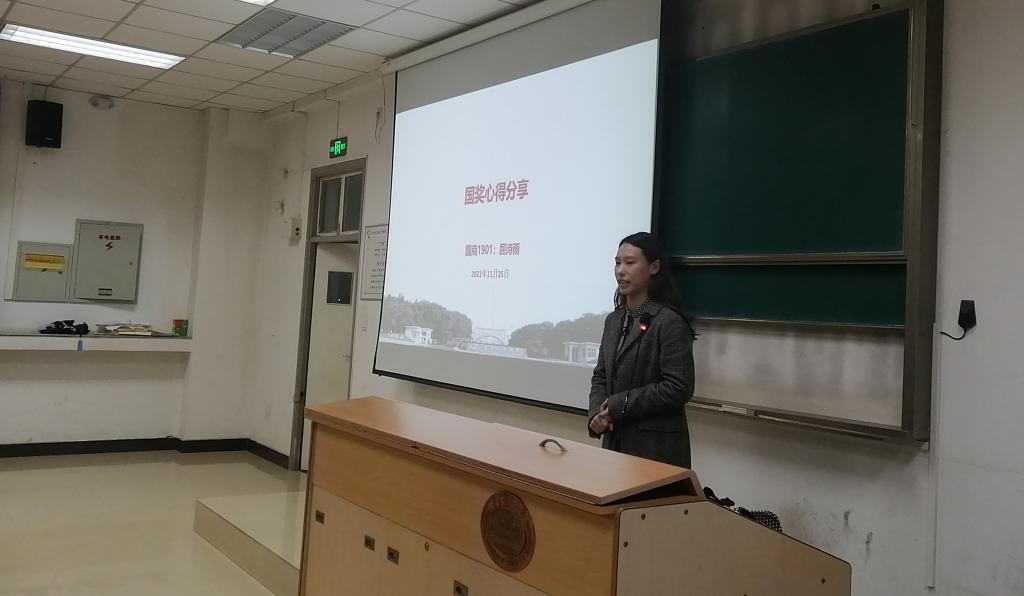 本次班会分为两部分进行,第一部分是国际商务1901班的优秀学姐屈诗雨的国奖心得分享。