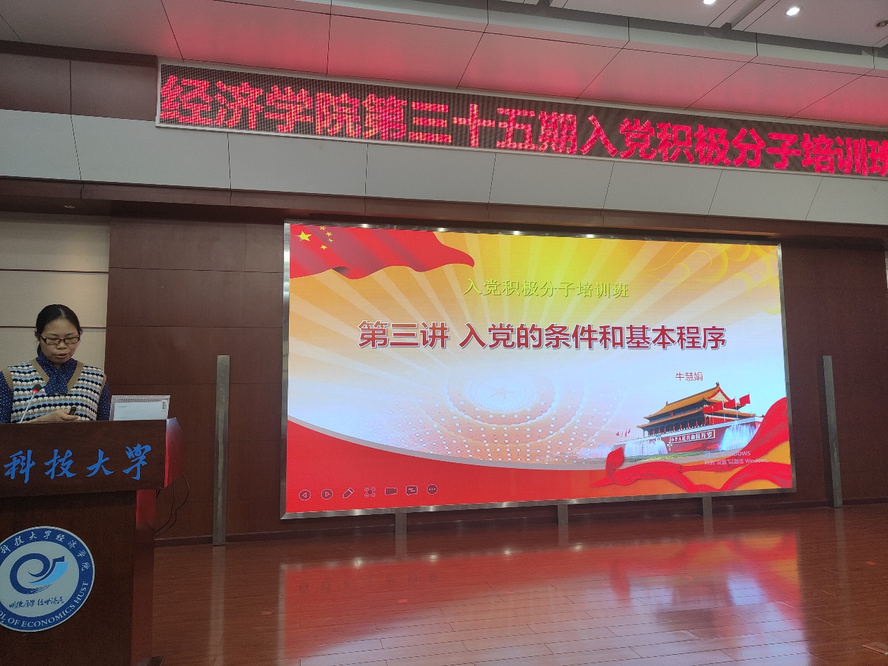 紧接着,牛慧娟老师为同学们讲授了以“入党的条件和基本程序”为主题的党课。牛老师通过优秀共产党员的事例,强调正确的入党动机是坚定地信仰共产主义、献身共产主义事业、更好地为人民服务的必要前提。牛老师要求同学们应加强理论修养,积极参加社会实践,培养自律意识,不断净化自己的入党动机,提高自我批评的自觉性。最后,牛老师为大家讲述了成为共产党员的基本条件和发展党员的基本程序,让大家对组织纪律、政治思想、行动要求等内容有了更深刻的认识。