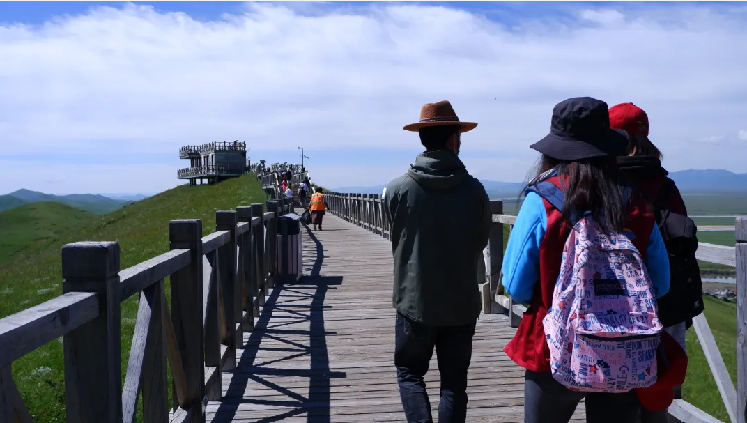 在花湖景区,景区在游客中心专门为实践队准备了一辆中巴车,由三名导游带领整个队伍进入花湖湿地草原的腹地。一路上,通过交谈,实践队员们了解到,关于“三产融合”,花湖同样允许牧民在景区内规定区域放牧,且在游客中心处也有许多牦牛奶、牦牛肉制品。由于处在热尔大草原腹地,花湖景区在环境保护方面有着更加严格的要求,以至于景区的木质栈道,其宽度都受到了严格的限制。然而单方面的严格要求并没能换来完全的保护,旅客不文明的游览行为,例如乱丢垃圾,违规踩踏草地等都对湿地生态造成了严重破坏,而景区却只能对这样的行为作出警告而没有惩罚的权力,这是目前花湖生态保护面临的最大困境。