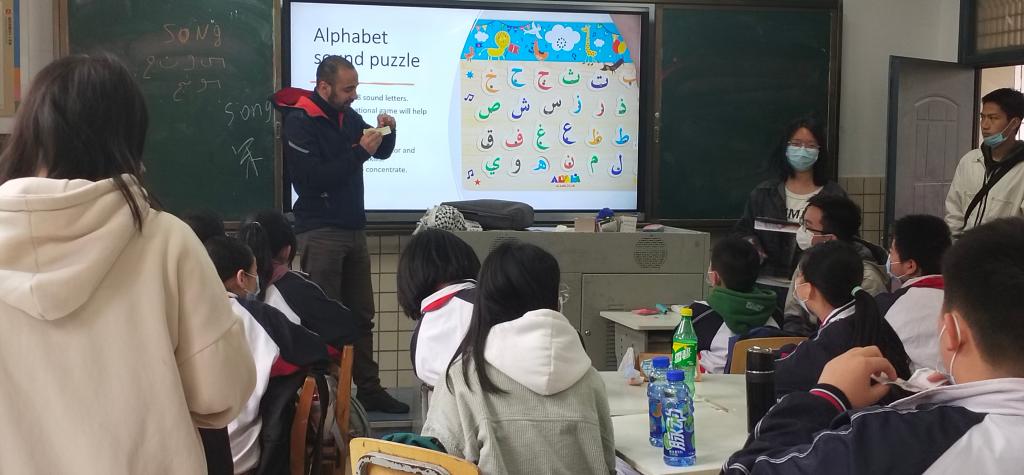 随后,国际职工们分享了他们童年的玩具。来自阿拉伯国家的志愿者杨航和于思娜介绍了他家乡的特色玩具和有趣文化现象。将玩具巧妙的和文化特色结合在一起,引发了同学的强烈兴趣。杨航介绍了阿拉伯数字的来历以及现在和过去阿拉伯数字的不同,还分享了自己带来的印有数字的卡片,大家连连感叹。于思娜流利的中文也大受同学们的欢迎。志愿者徐圆兰为员工们进行翻译,帮助同学们更好地理解职工志愿者展示的内容,现场气氛轻松愉快。