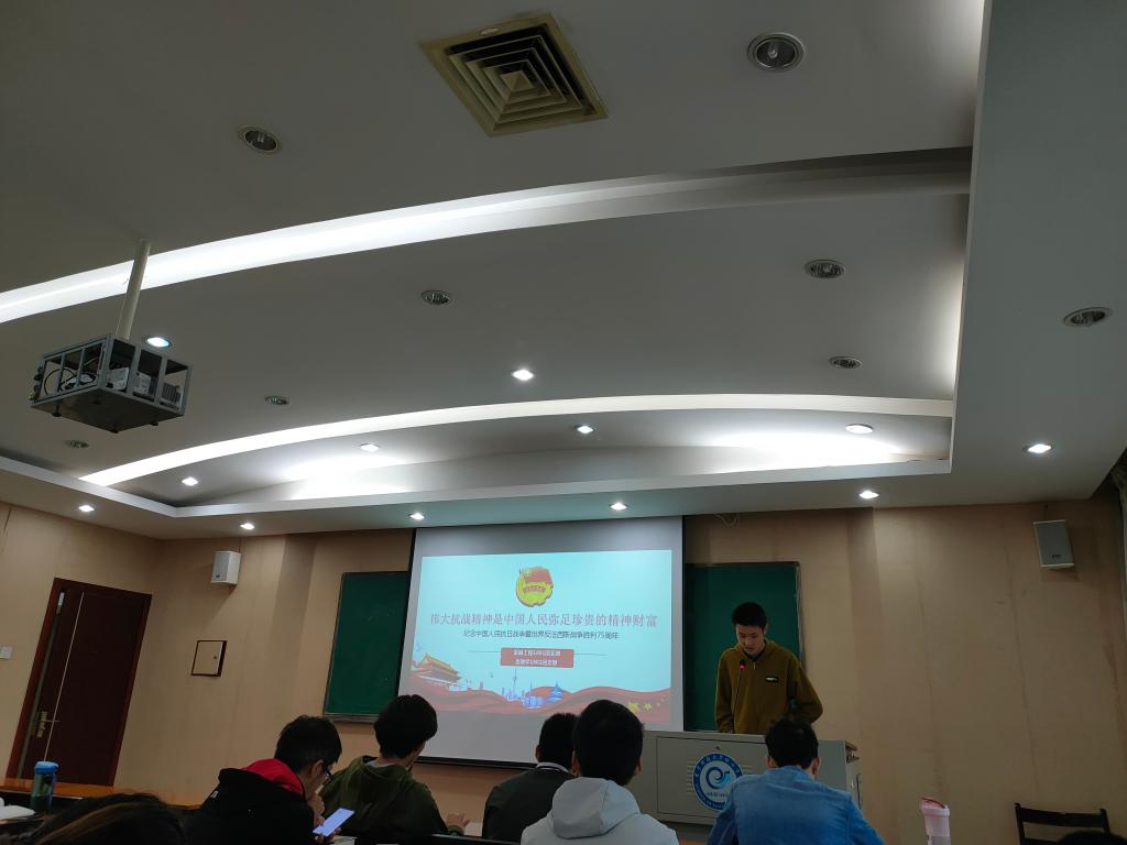 团会伊始,全体团员齐唱团歌,歌声哄亮,气势宏伟,展现着团员们蓬勃的朝气和热情昂扬的活力。接着,团支书孔令凯从座谈会背景、座谈会内容、抗战精神解读三个大方面开始了本次团会的讲解。