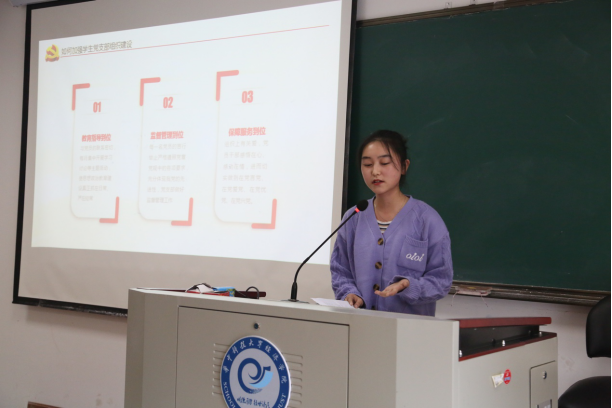 最后,研究生工作组赵广燕老师作出总结,她指出党内政治生活一定要贯彻落实“四性”要求。政治性确保了党内政治生活方向的正确性,是基础性原则;时代性确保了党的先进性;原则性是开展党内政治生活的准绳,判断是非曲直的标准;战斗性是组织战斗力的保证。她强调,坚守“四性”是坚定理想信念的必然要求,希望大家具备“功成不必在我,功成必定有我”的牺牲奉献精神,积极融入党组织,怀揣着坚定的信心投身于共产主义事业;坚守“四性”是遵守党的纪律的底线要求,大家应深入学习党的各项准则与条例,明了党纪严于国法,严守各项纪律,把党支部建设地坚强有力得人心;坚守“四性”是肩负担当使命的本质性要求,并以抗疫英雄的先进事迹为例,勉励大家在新时代敢于担当和作为,无愧于前辈打下的坚实基础。