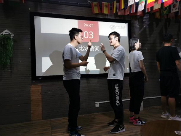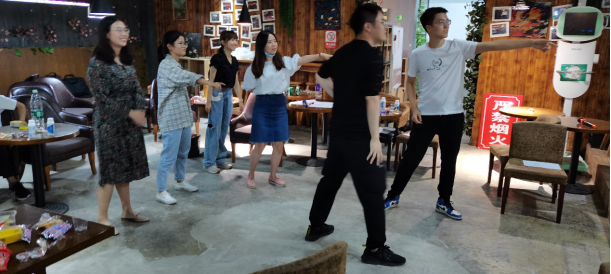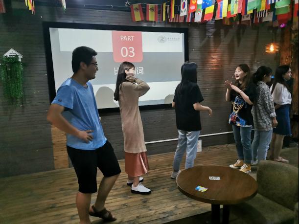 为了尽快调动氛围,拉近同学们之间的距离,班级同学在主持人的带领下开展了“记名字”、“比划猜词&你画我猜”和“谁是卧底&狼人杀”三个游戏。第一个游戏分为顺序记名字和跳跃记名字两个环节,两轮游戏下来,同学们基本能记住彼此的名字。在后两个游戏中,通过智力比拼合团队协作,增进了同学间的交流,是大家彼此之间熟悉了起来。在游戏进行的同时,彭刚东同学献唱《我们正年轻》;其后,游戏中的得分最低组接受惩罚,在现场学跳《海草》舞,将团建活动推向了高潮,载歌载舞中,大家侃侃而谈,同学们之间的陌生和隔阂逐渐消除,整个班级融为了一体。