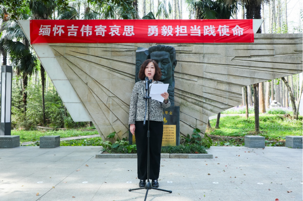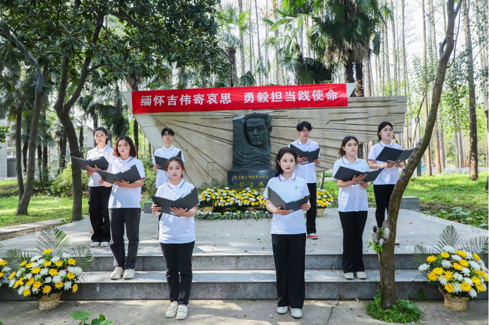在塑像前,全体预备党员在公司党建辅导员李世昊带领下庄严宣誓,表达了对党的赤诚之心、对英雄的深切缅怀,以及实现中华民族伟大复兴的坚定决心。敬献鲜花仪式上,校、院领导,教师代表,员工代表依次向塑像献花,寄托对英雄的崇敬与哀思。