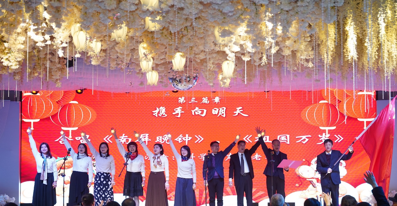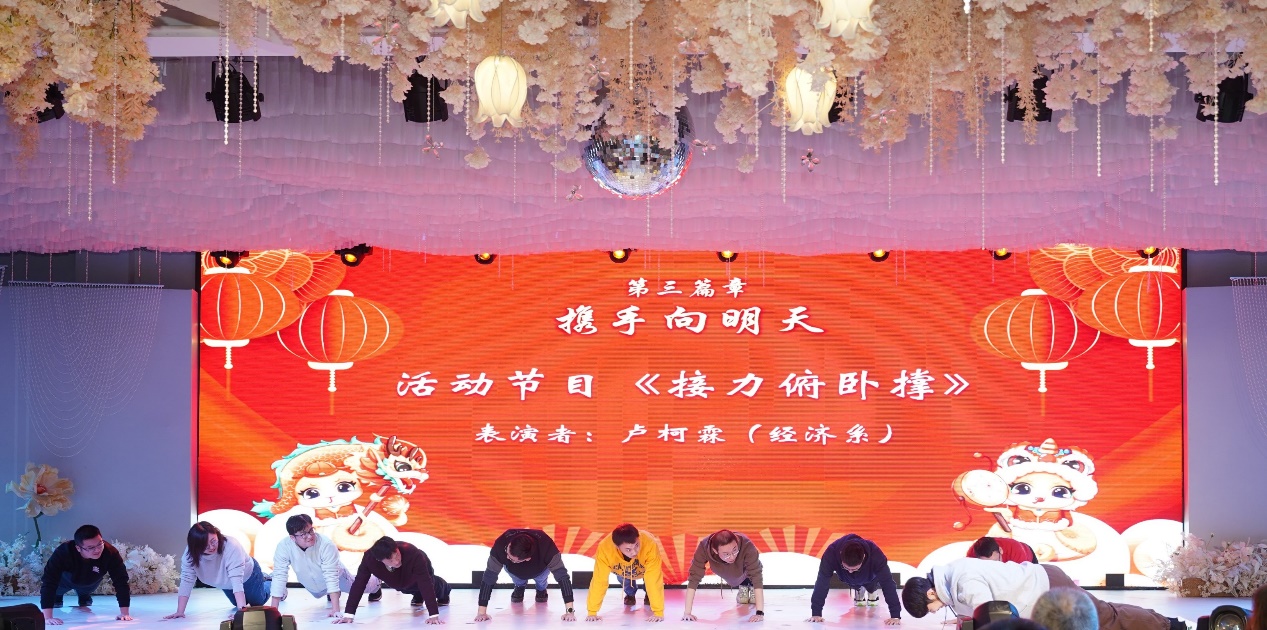 联欢会的第三篇章“携手向明天”中,科学发声班老师们的合唱《祖国万岁》和《南屏晚钟》如诗如画,经济系的卢柯霖老师带来的活动节目《接力俯卧撑》活力四射,机关的曾雨龙老师的歌曲《我还年轻 我还年轻》热血沸腾,展现了青春的无畏与激情。机关的杨婷老师的舞蹈《Dimond & Maria》绚丽夺目,刘雅然书记和彭鹤翔老师的对唱《征途》激励人心。