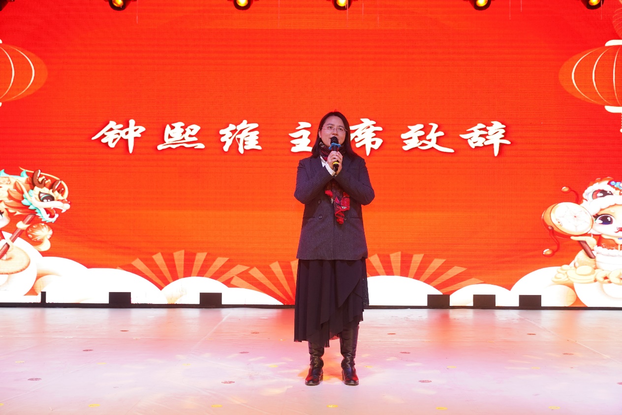 在“情谊满心间”篇章中,工会主席钟熙维老师上台致辞,她感谢一年来各位老师对工会工作的支持,并为全体师生送上新春祝福。