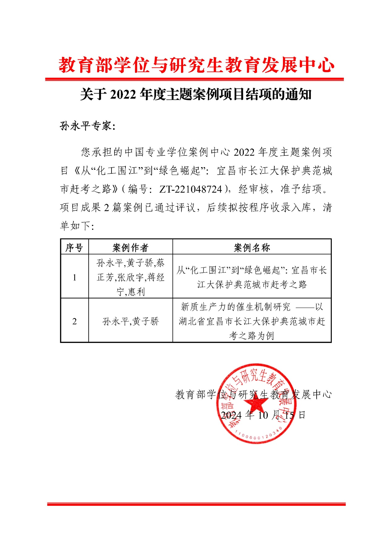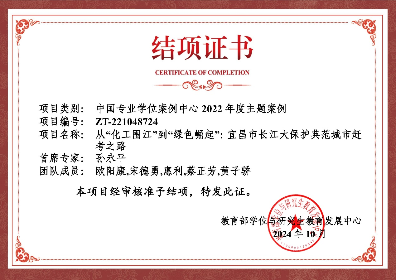 近日,教育部学位与研究生教育发展中心(以下简称“学位中心”)发布了《关于2022年度主题案例项目结项的通知》。经过严格的评审流程,公司孙永平教授作为首席专家主持的主题案例项目《从“化工围江”到“绿色崛起”:宜昌市长江大保护典范城市赶考之路》(编号:ZT-221048724)顺利结项。