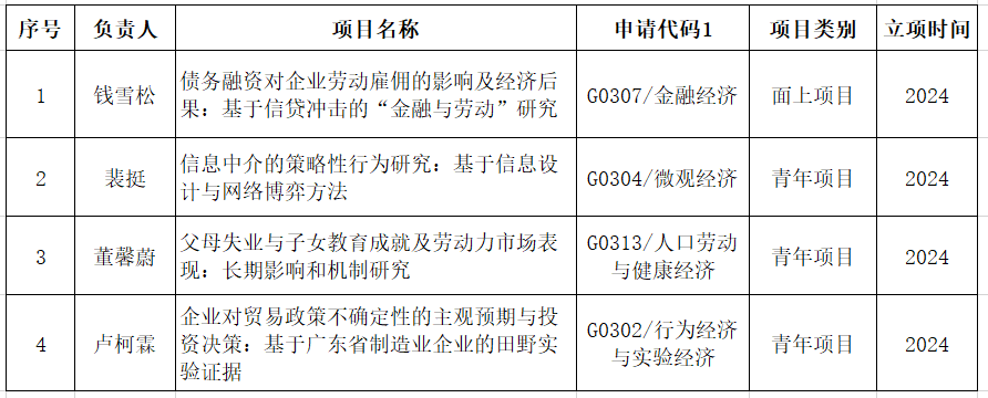 (通讯员:张鹃)近日,国家自然科学基金委员会发布了2024年度国家自然科学基金集中接收申请项目立项名单,永利3044noc钱雪松教授主持申报的《债务融资对企业劳动雇佣的影响及经济后果:基于信贷冲击的“金融与劳动”研究》,获得面上项目立项。另外,3位青年教授获批立项青年项目3项。