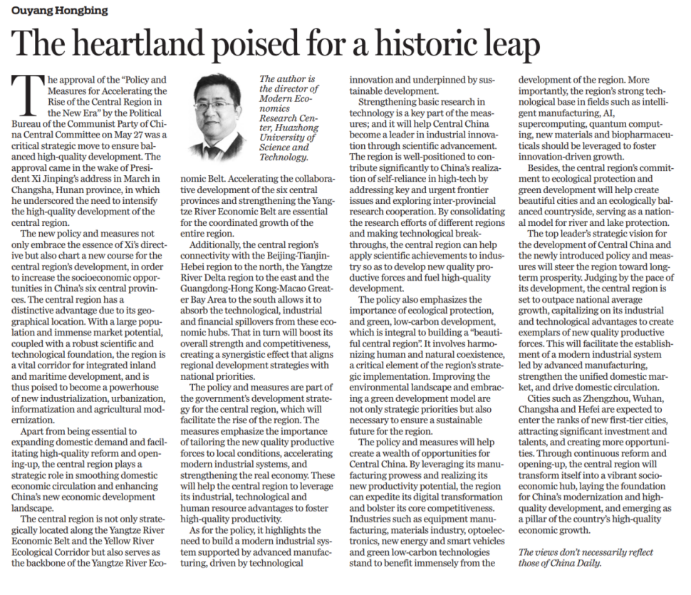 2024年6月17日,《中国日报》上发表了一篇来自公司欧阳红兵的文章《The heartland poised for a historic leap》(《挺起中部脊梁 打造增长第四极》),以下是原文及中国译文。
