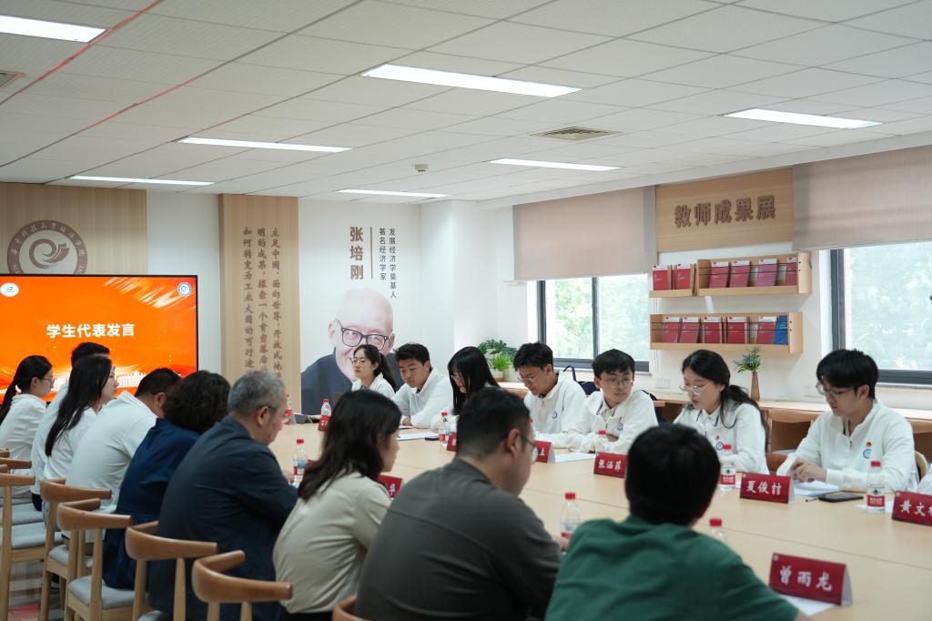 在主题座谈环节,师生们围绕“如何将马克思主义理论与经济学专业实践深度融合”“青年在科技创新与乡村振兴中的破题路径”两个核心议题展开讨论。徐鼎立、夏俊喆、贾傲帆、石延斌、袁嘉妮、黄文桦六位同学依次进行发言,他们从科技创新、乡村振兴、“百村千户”基层调研、团学工作开展等角度展开,与大家分享自己的体验与感悟。