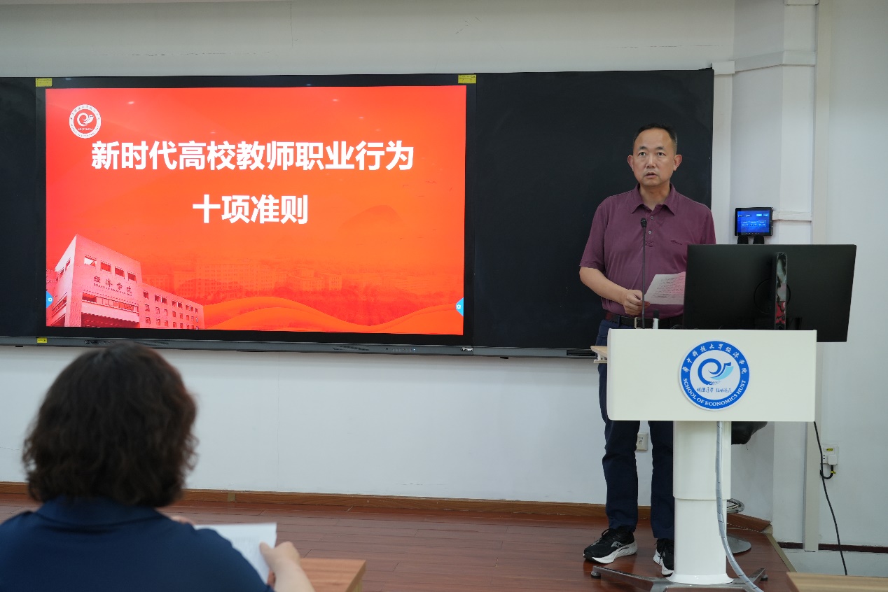 副书记、副经理姚遂带领全体教职工重温《新时代高校教师职业行为十项准则》。他指出,全体教师需牢记“立德树人”根本任务,关爱员工,言传身教,以高尚师德和扎实学识践行育人使命。