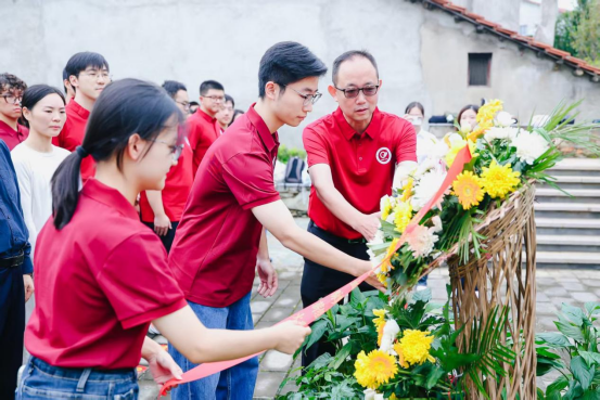 公司全体师生在张培刚先生铜像前整齐列队,肃立默哀、鞠躬缅怀,姚遂老师及本科数字经济2502班刘芊旬、硕士2503班雷宜璋同学共同上前敬献花篮、整理缎带,向张培刚先生表达最深切的缅怀与最崇高的敬意。
