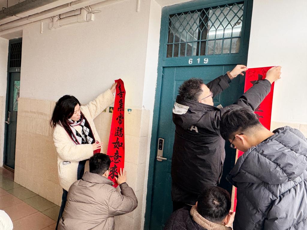 2月1日上午,学工组一行来到本科生宿舍区。刘雯雯与留校员工亲切交谈,详细询问留校员工的学习安排、生活状况和假期计划,叮嘱合理规划时间、注重劳逸结合,并着重强调了在校期间的安全注意事项。交流结束后,师生共同将寓意吉祥的春联张贴于宿舍门前,红纸墨香间洋溢着喜庆祥和的节日氛围。