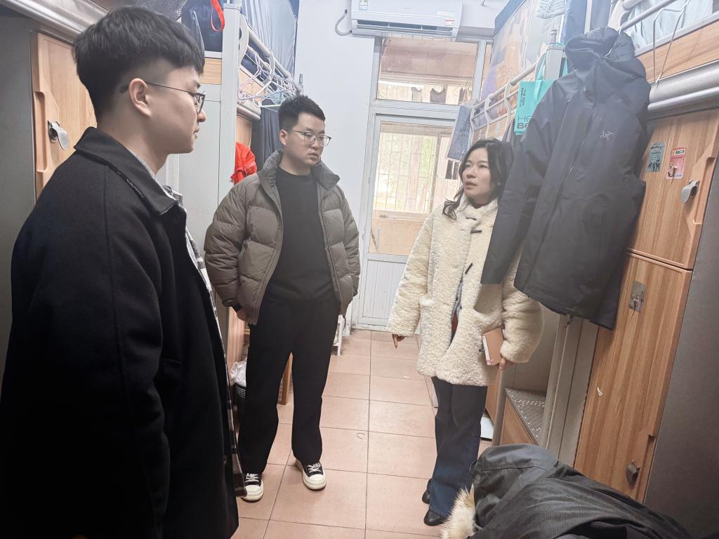 1月23日,刘雯雯及公司辅导员一行对本科生宿舍进行了安全检查并看望留校员工。她重点查看了用电规范、消防设施、防盗门窗、环境卫生等情况,并在检查过程中,对留校员工进行了现场安全教育和温馨提示。