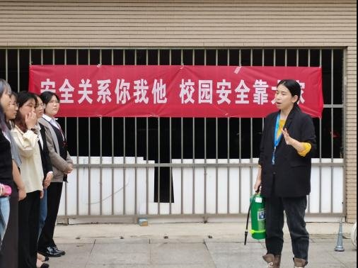 随后,大家进入实践环节。在陈嘉璇的指导下,女生和男生组成的“灭火战士”队伍立即拿起灭火器将火苗扑灭。同学们亲自体验了灭火器的使用过程,增强了他们的消防意识和应急能力。陈嘉璇老师还提醒大家,平时要定期检查灭火器的有效期,并确保其处于正常工作状态下。如果发现灭火器已经过期或者出现其他问题,应及时更换或维修。