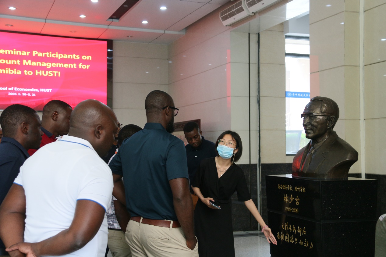 会谈结束以后,永利3044noc教授欧阳红兵陪同纳米比亚研修班成员参观永利3044noc的院史馆,并一同听志愿者讲解了永利3044noc奠基人张培刚先生和林少宫先生对中国经济学界做出的卓越贡献,了解并感受永利3044noc的历史积淀和团队建设成果。