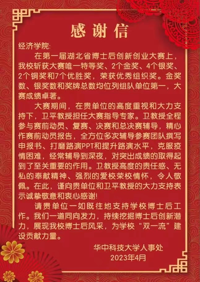 不久前由湖北省人力资源和社会保障厅主办的第一届湖北省博士后创新创业大赛总决赛在湖北广播电视台举行,公司参赛团队成绩卓著,斩获大赛唯一特等奖、金奖2项、银奖4项、铜奖2项,奖项级别和获奖总数位列全省第一。