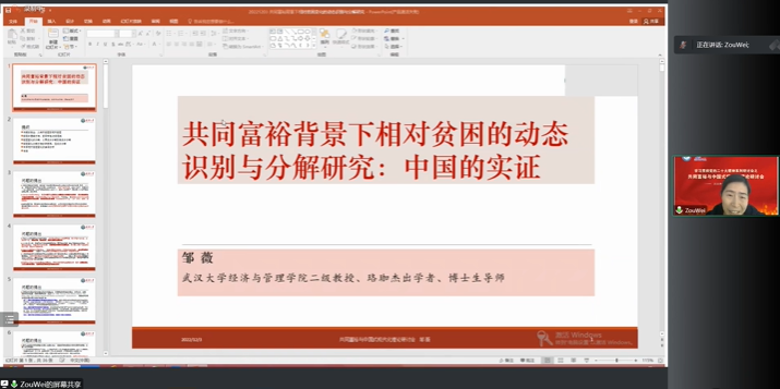 第三位演讲嘉宾为武汉大学经济与管理公司二级教授、珞珈杰出学者邹薇,她的发言主题是《共同富裕背景下相对贫困的动态识别与分解研究:中国的实证》。该研究基于绝对贫困线与相对贫困线制定标准差异大,相对贫困无法直接进行跨国比较,以及绝对贫困能够被公共政策消除而相对贫困会长期存在等背景,探讨了如何基于中国国情确定相对贫困线标准,并对绝对贫困和相对贫困进行量化分解,最终揭示脱贫攻坚政策在减贫上的具体成效和实现机制等问题。