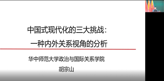 第一位演讲嘉宾为华中师范大学政治与国际关系公司经理胡宗山,他发表的演讲题目为《中国式现代化的三大挑战:一种内外关系视角的分析》。胡经理首先对十九大和二十大两次党代会报告对国际形势判断进行了对比。他提到十九大报告中指出当国内外形势正在发生深刻复杂变化,我国发展仍处于重要的战略机遇期,前景十分光明,挑战也十分严峻,世界正处于大发展大变革大调整时期,和平与发展仍然是时代主题。而在二十大报告中则指出世界之变、时代之变、历史之变正以前所未有的方式展开,一方面,和平、发展、合作、共赢的历史潮流不可阻挡,人心所向、大势所趋决定了人类前途终归光明;另一方面,恃强凌弱、巧取豪夺、零和博弈等霸权、霸道、霸凌等行径危害深重,而和平赤字、发展赤字、安全赤字、治理赤字加重,使得人类社会面临前所未有的挑战。他提到,二十大报告中这些表述的变化可以说明当前的国际形势非常严峻,可以看出党和国家对安全问题的重视程度在不断加强。