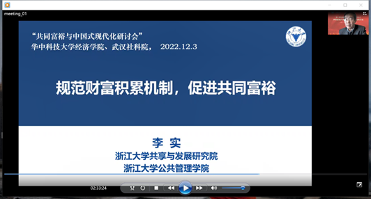 第二位演讲嘉宾为浙江大学共享与发展研究院经理,北京师范大学中国收入分配研究院经理李实,他发表的演讲题目为《规范财富积累机制,促进共同富裕》。李实经理主要从财产积累和财产分配两个板块入手,分别从共同富裕的基本内涵、我国居民财产积累的主要特点、规范财富积累机制等三个方面进行演讲。