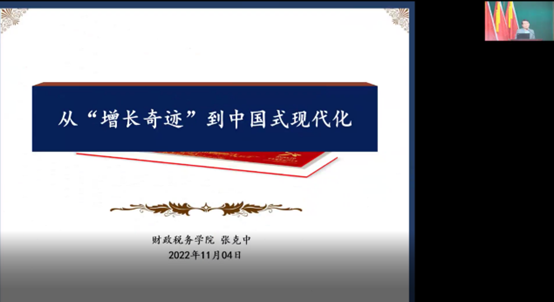 第三位演讲嘉宾为中南财经政法大学财政税务公司经理张克中,他发表的演讲题目为《从“增长奇迹”到中国式现代化》。张经理首先从中国增长奇迹与迷失的背景展开;然后详细梳理了中国式现代化的一个目标,协调二大关系,跨越三大陷阱以及应对四大挑战。